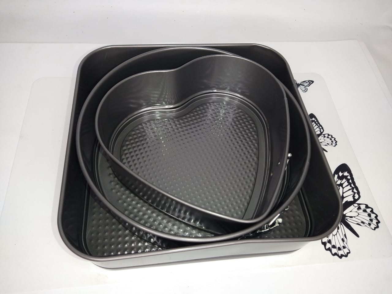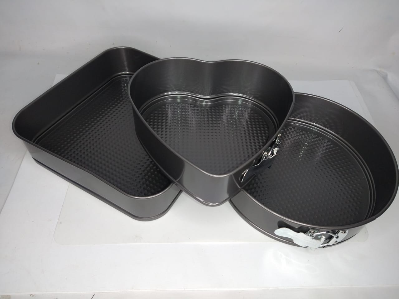 SET DE TORTERAS X 3 – ANTIADHERENTE – DESMONTABLE – CORAZÓN 21 CM – REDONDO 24 CM. – CUADRADO 26 X 26 CM.
